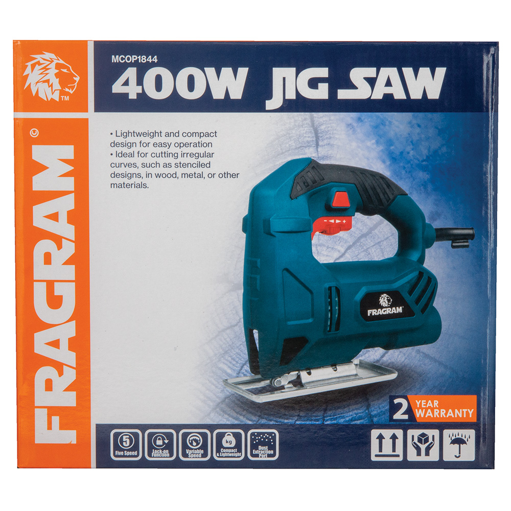 The Fragram 400W Jigsaw is a handy power tool to use to help ease through DIY projects. The 5-speed Jigsaw can make both straight and curved cuts into wood, providing many uses for various DIY applications. Light and compact in design, the soft grip handle includes a lock-on function for added comfort, thus allowing you to work for longer periods. The versatile tool has an adjustable shoe for ease of angled cutting of shapes and curves in wood of various thicknesses. The dust extraction port allows you to connect a workshop vacuum to the tool to extract sawdust from the cutting line as you work, keeping your workpiece free of debris.