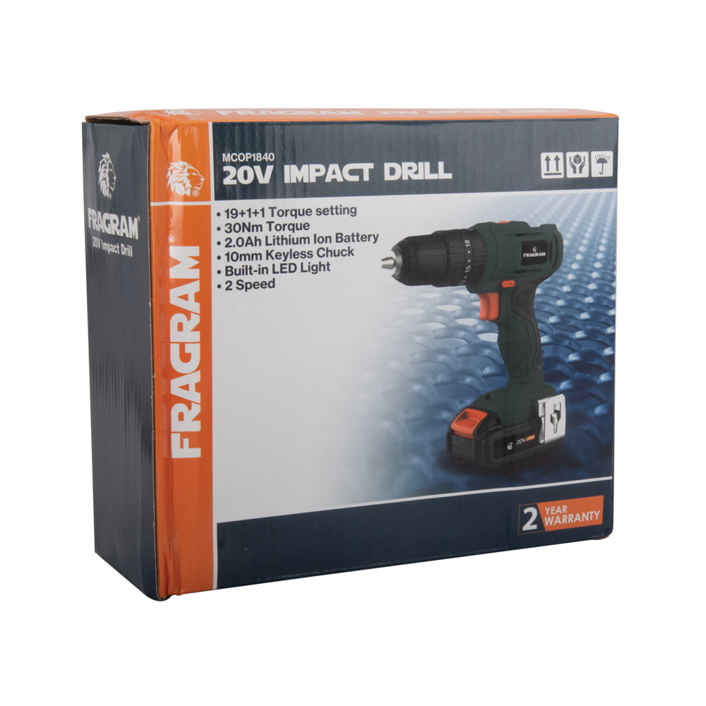 Ideal for the hobby enthusiast, the compact Fragram 20V Impact Drill is a handy power tool to use in and around the house or for DIY projects. The 30NM torque and 18 torque setting provides precise control for drilling into various materials, enabling the user to complete a wider variety of jobs with a single tool. The versatile impact drill has a drilling capacity of 20mm into wood and 10mm into steel and concrete. The 10mm keyless chuck allows efficient changing of drill bits. Fitted with a built-in LED light, the drill offers two speed adjustments for convenient control of speed on various surfaces.