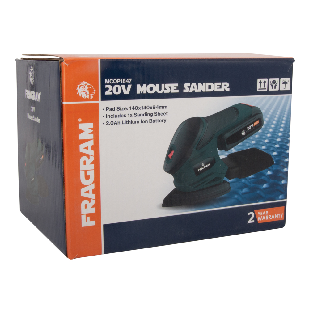 Delivering the power, performance and mobility required to give DIY projects an ultra-smooth finish, the Fragram 20V Mouse Sander has a pad size of 140 x 140 x 94mm. The no load speed of 12 000/min ensures quick debris removal while the dust collector keeps the workplace clean. For your convenience a 2.0Ah lithium-ion battery, charger, dust collector and sanding sheet are all supplied as standard with this product.