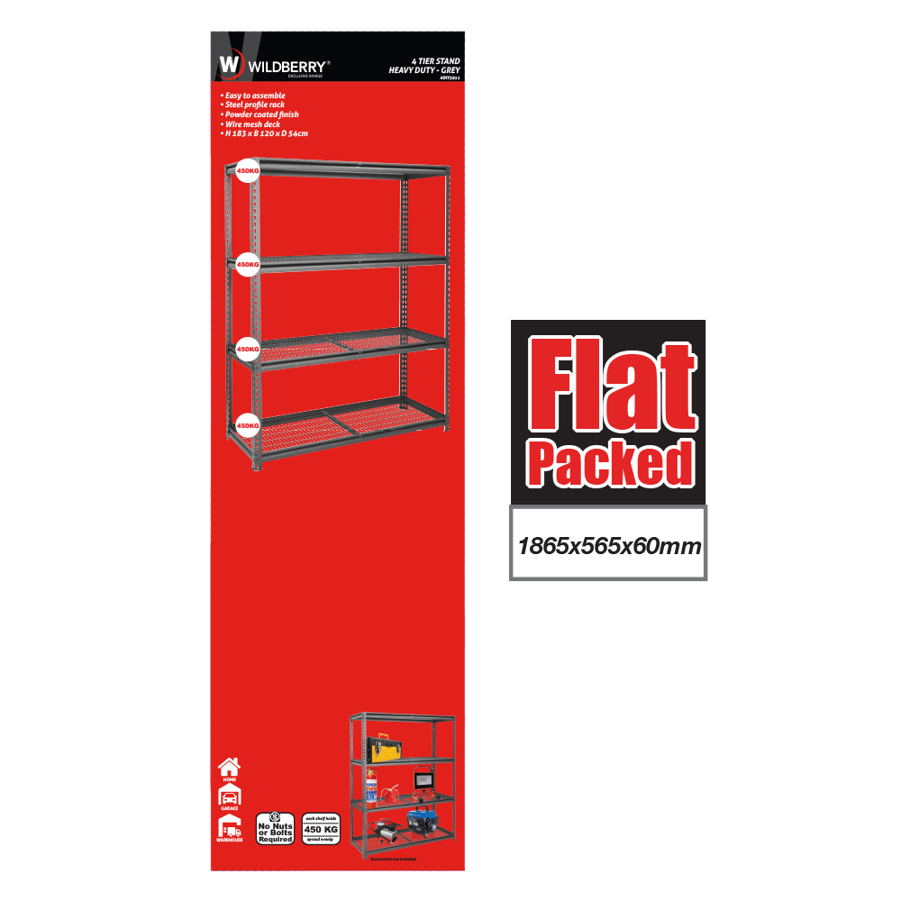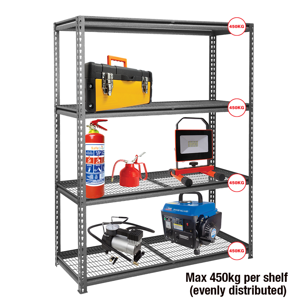 Introducing our Heavy Duty Garage Shelving in Grey, designed to meet all your storage needs with style and durability. Each shelf can hold a maximum of 450kg when evenly distributed, allowing for a total weight capacity of 1800kg.