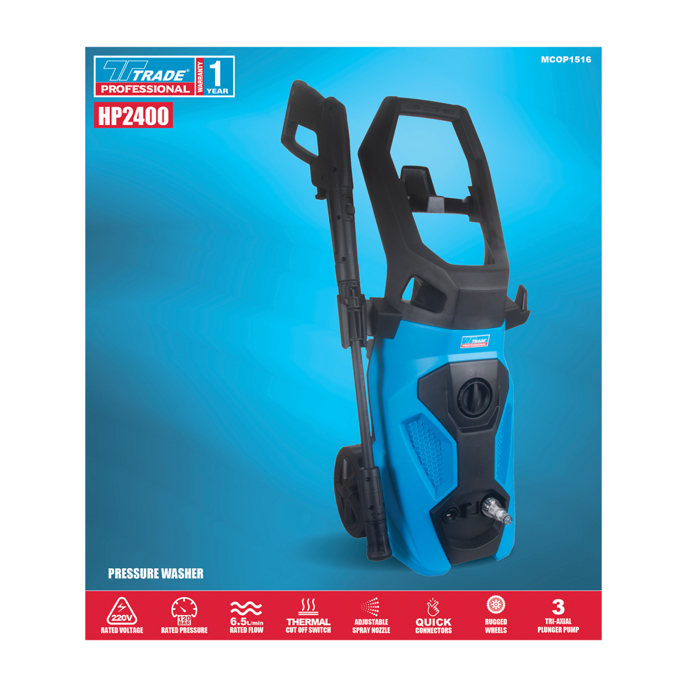 The Trade Professional 2400Hp High Pressure washer provides great strength and versatility for cleaning block paving, cars, gutters, muddy vehicles and roof tiles. Supplying a rated pressure of 120bar and a 6.5L/min flow, the adjustable nozzle allows for different spray settings to suit the cleaning task. The machine is manufactured with a low vibration and sound level. Designed with a tough carry handle and rugged wheels for easy transportation, the machine is supplied with essential accessories and a 1-year warranty.